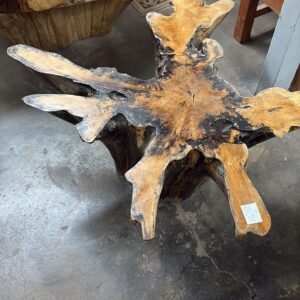This product is a coffee table carved from a single piece of reclaimed teak root. The table features a solid wood form with a radial top surface and a sculpted base that follows the natural structure of the root. The surface retains natural texture and visible wood grain from the original material. The specific piece selected is used to create the finished table and is paired with a chosen base style during construction.